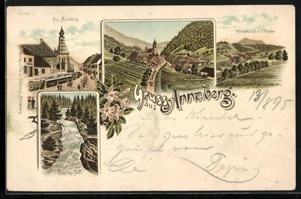 Vorläufer-Lithographie Annaberg, 1895, Lessing-Fall, Wienerbruck m. d. Ötscher, Ortsansicht