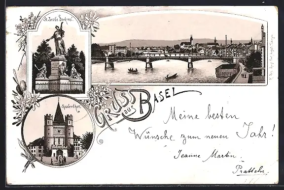 Vorläufer-Lithographie Basel, 1895, Spalenthor, St. Jacobs-Denkmal und Flusspartie