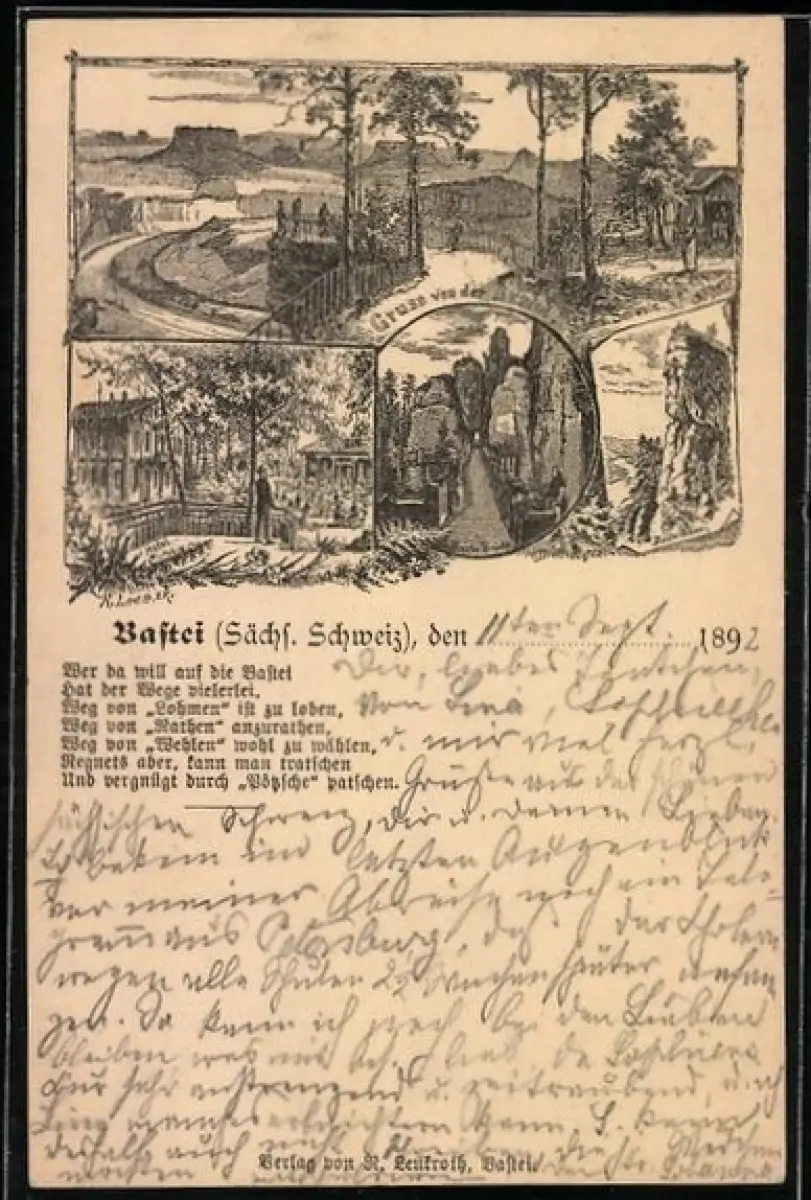 Vorläufer-Lithographie Bastei /Sächs. Schweiz, 1892, Hotel, Bastei-Brücke und Basteifelsen, Ganzsache