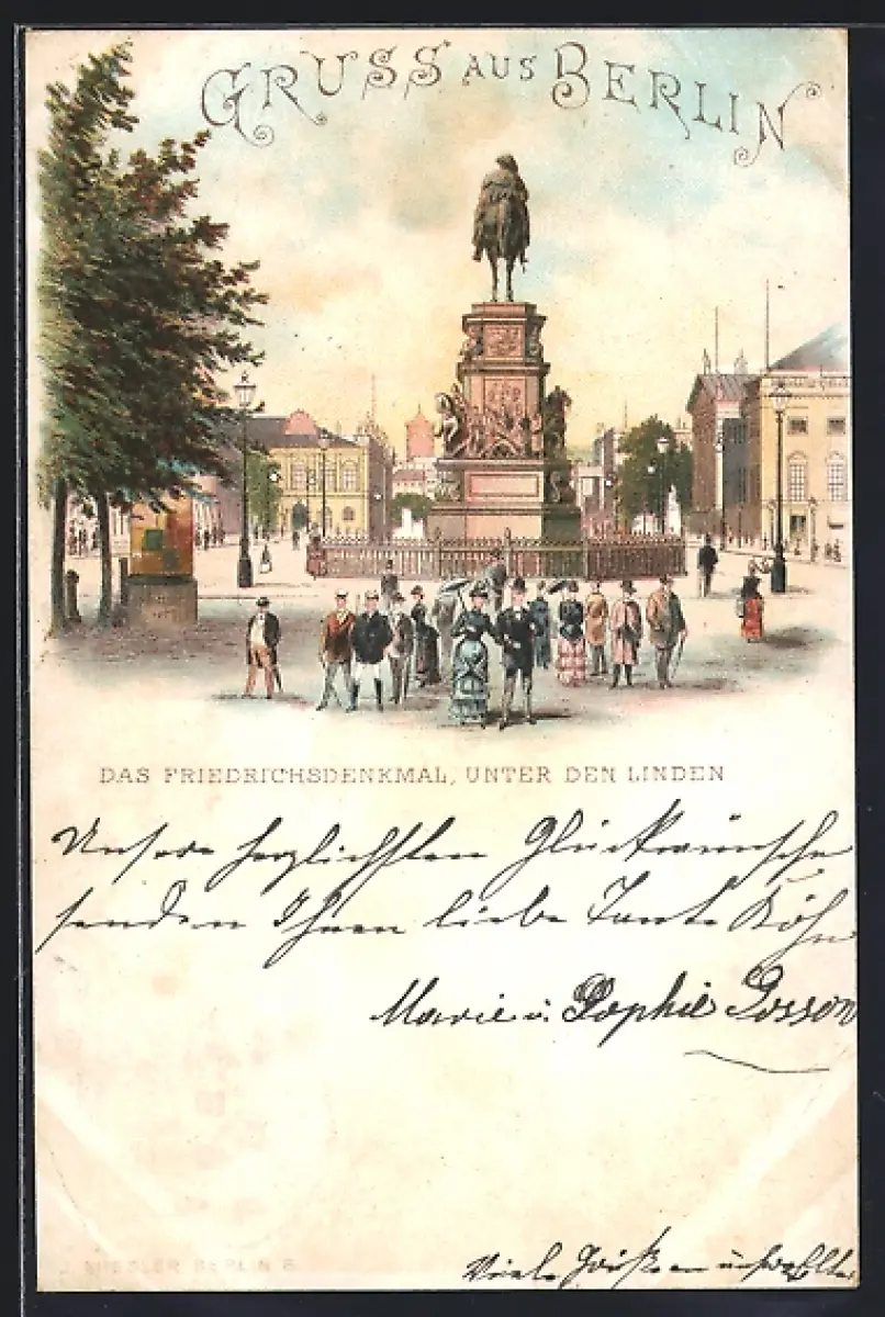 Vorläufer-Lithographie Berlin, 1895, Friedrichsdenkmal unter den Linden