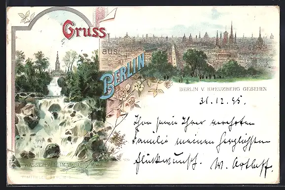 Vorläufer-Lithographie Berlin-Kreuzberg, 1895, Wasserfall im Viktoriapark, Blick über die Stadt