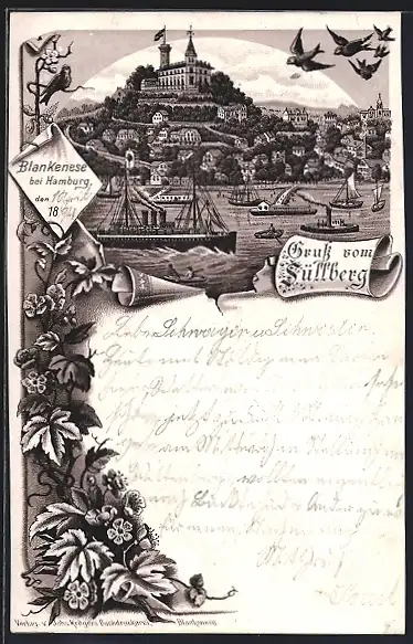 Vorläufer-Lithographie Blankenese bei Hamburg, 1894, Schiffe vor dem Süllberg