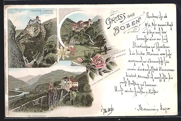 Vorläufer-Lithographie Bozen, 1895, Schloss Karneid von der Strasse, Burg Runkelstein, Haselburg