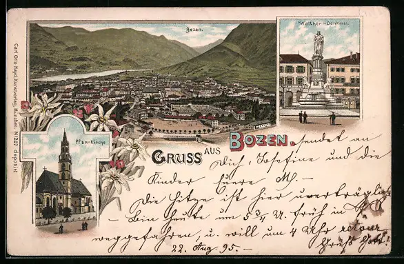 Vorläufer-Lithographie Bozen, 1895, Totalansicht, Walther-Denkmal, Pfarrkirche