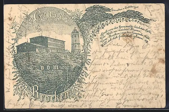 Vorläufer-Lithographie Brocken, 1895, Gasthaus und Aussichtsturm, Hexenaltar und Teufelskanzel, Ganzsache