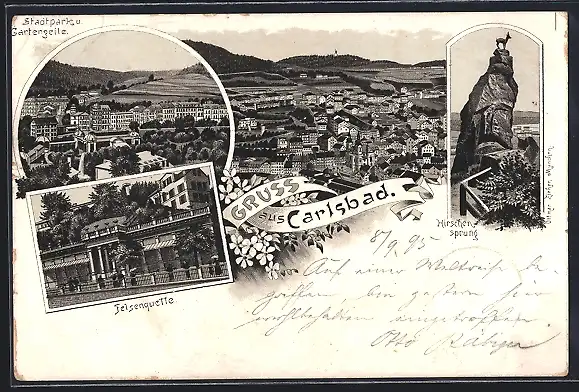 Vorläufer-Lithographie Calrsbad, 1895, Stadtpark und Gartenzeile, Felsenquelle, Hirschensprung