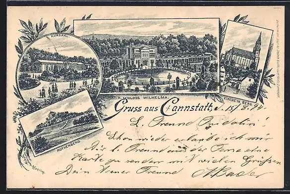 Vorläufer-Lithographie Cannstatt, 1894, K. Schloss Wilhelma, Kirche in Berg, Rothenberg, Kursaal