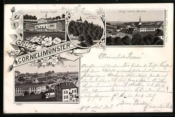 Vorläufer-Lithographie Cornelimünster, 1893, Kneipp-Anstalt, Königliches Lehrer-Seminar, Klauserwäldchen und Eremitage