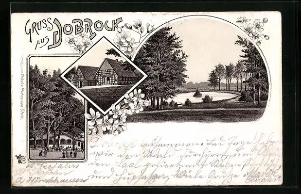 Vorläufer-Lithographie Dobrock, 1895, Gasthaus, Fachwerkhäuser, Garten mit Teich