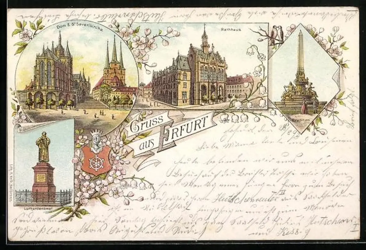 Vorläufer-Lithographie Erfurt, 1893, Dom & St. Severikirche, Rathaus, Lutherdenkmal