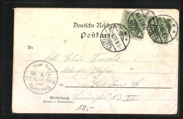 gelaufen 1895, Eckknick li. unten, Stempelspur, rückseitig Klebe- und Papierreste, guter Zustand