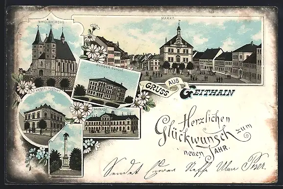 Vorläufer-Lithographie Geithain, 1895, Nikolaikirche, Bürger-Schule, Bahnhof, Neujahrsgruss