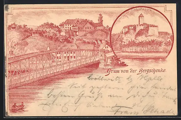 Vorläufer-Lithographie Halle /Saale, 1893, Gasthof Bergschenke, Blick auf den Giebichenstein