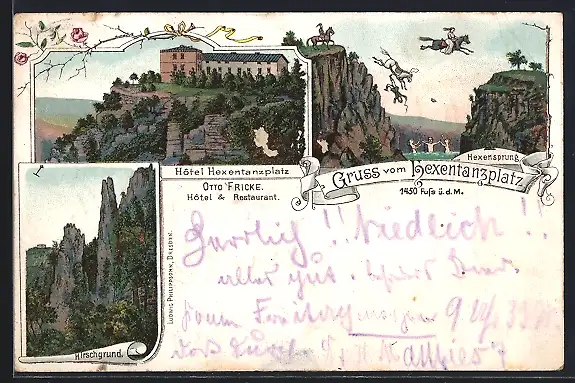 Vorläufer-Lithographie Hexentanzplatz, 1894, Hotel v. Otto Fricke, Hexensprung, Hirschgrund