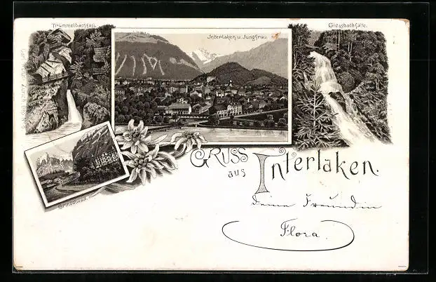 Vorläufer-Lithographie Interlaken, Trümmelbachfall, Glessbachfall, Jungfrau 1895