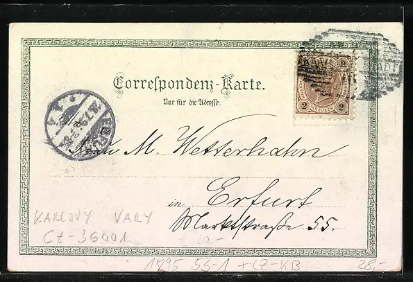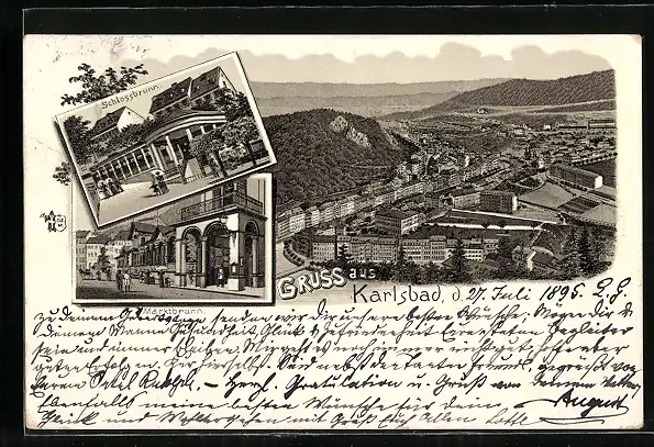 Vorläufer-Lithographie Karlsbad, 1895, Panorama, Schlossbrunn, Marktbrunn