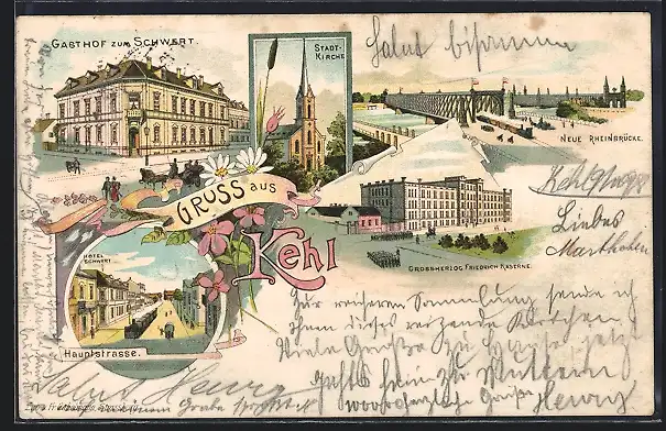 Vorläufer-Lithographie Kehl, 1893, Gasthof zum Schwert, Hauptstrasse, Stadt-Kirche