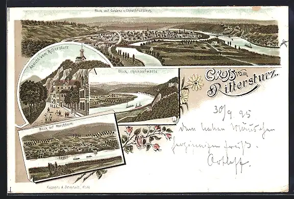 Vorläufer-Lithographie Koblenz, 1895, Rittersturz, Blick auf Horchheim und Ehrenbreitenstein