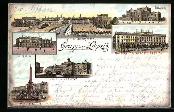 Vorläufer-Lithographie Leipzig, 1895, Augustusplatz, Museum, Theater, Kaiserl. Ober-Postdirektion, Neue Universität