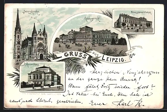 Vorläufer-Lithographie Leipzig, 1895, Reichsgericht, Konzerthaus, Peterskirche