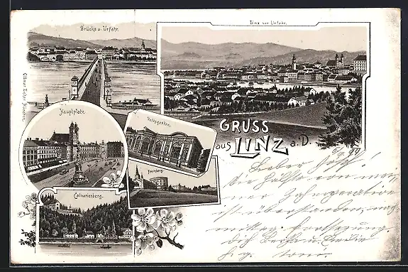 Vorläufer-Lithographie Linz a. D., 1894, Brücke u. Urfahr, Hauptplatz, Volksgarten, Calvarienberg, Freinberg