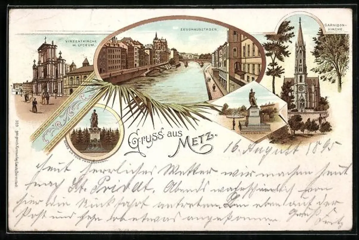 Vorläufer-Lithographie Metz, 1895, Zeughausstaden, Vinzentkirche mit Lyceum, Garnisonkirche