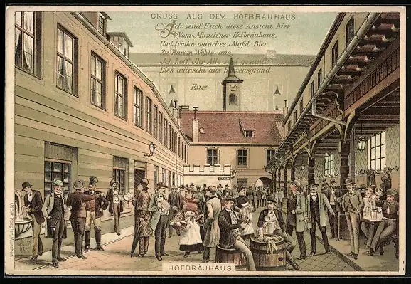 Vorläufer-Lithographie München, 1895, Münchner Hofbräuhaus mit Gästen im Innenhof