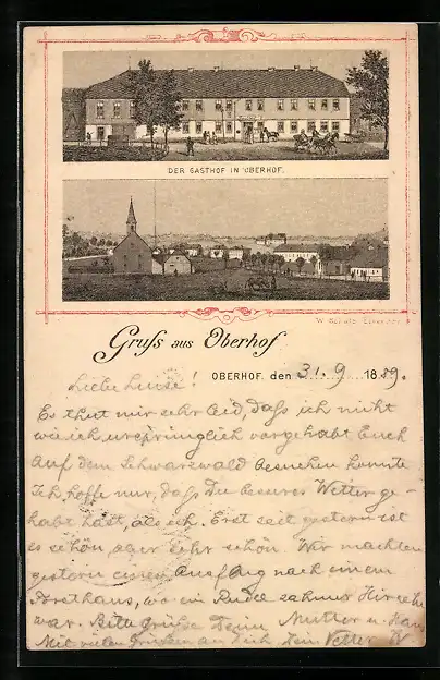 Vorläufer-Lithographie Oberhof, 1889, Ansicht vom Gasthof, Teilansicht mit Kirche