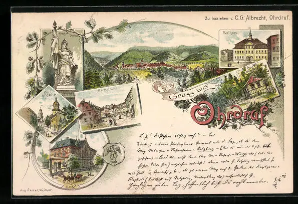 Vorläufer-Lithographie Ohrdruf, 1895, Rathaus, Post, Marktstrasse