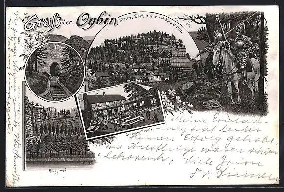 Vorläufer-Lithographie Oybin, 1895, Gesellschaftsplatz mit Gasthof, Kirche, Dorf, Ruine und Berg, Ritter