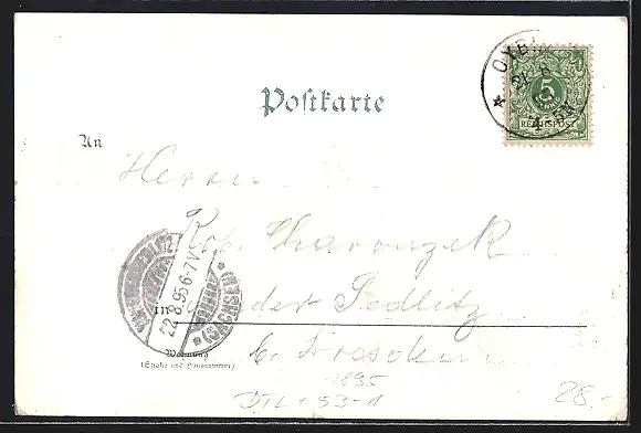 Personenbezogene Daten auf der Rückseite der Karte wurden durch blauen Textmarker unkenntlich gemacht. Die blauen Stellen sind auf die Vorderseite durchgeweicht und wirken sich negativ auf das Postkartenfoto aus