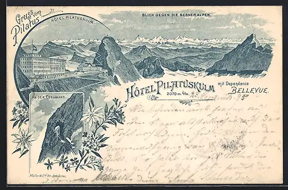 Vorläufer-Lithographie Pilatus, 1895, Hotel Pilatuskulm, Bergbahn an der Eselwand, Blick gegen die Berneralpen