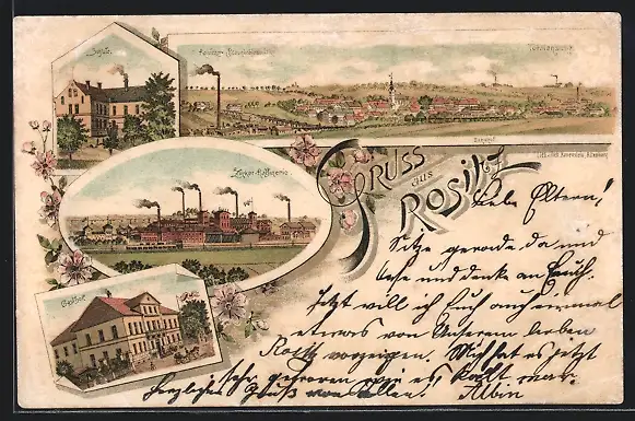 Vorläufer-Lithographie Rositz, 1895, Gasthof, Zucker-Raffinerie, Rositzer Braunkohlenwerke