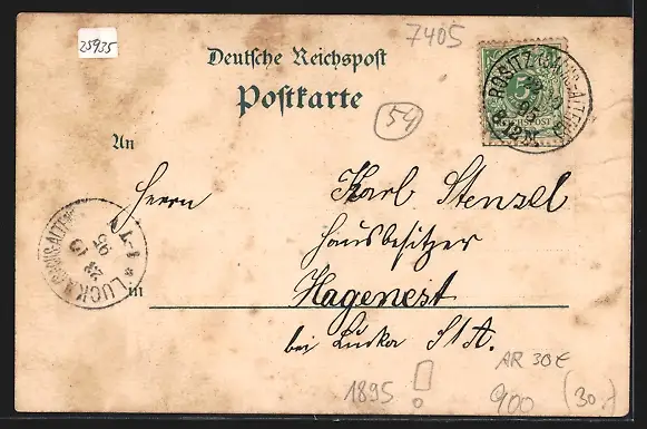 gelaufen 1895, rückseitig Klebe- und Papierreste, Eckknick re. oben, guter Zustand