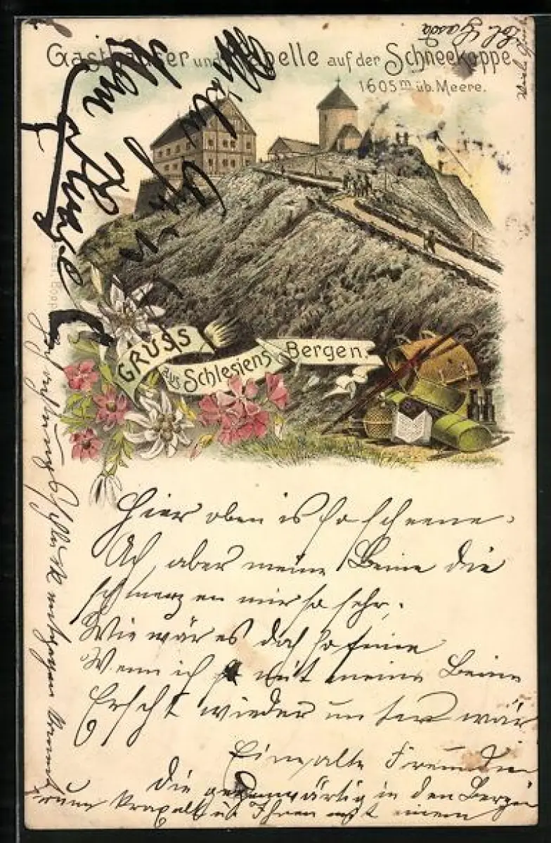 Vorläufer-Lithographie Schneekoppe /Schlesien, 1895, Gasthäuser und Kapelle auf dem Gipfel