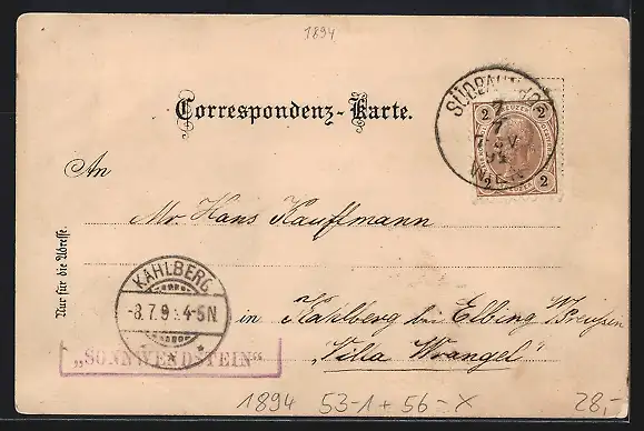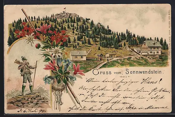 Vorläufer-Lithographie Schottwien, Gruss vom Sonnwendstein, 1894, Jodler in Tracht auf dem Gipfel