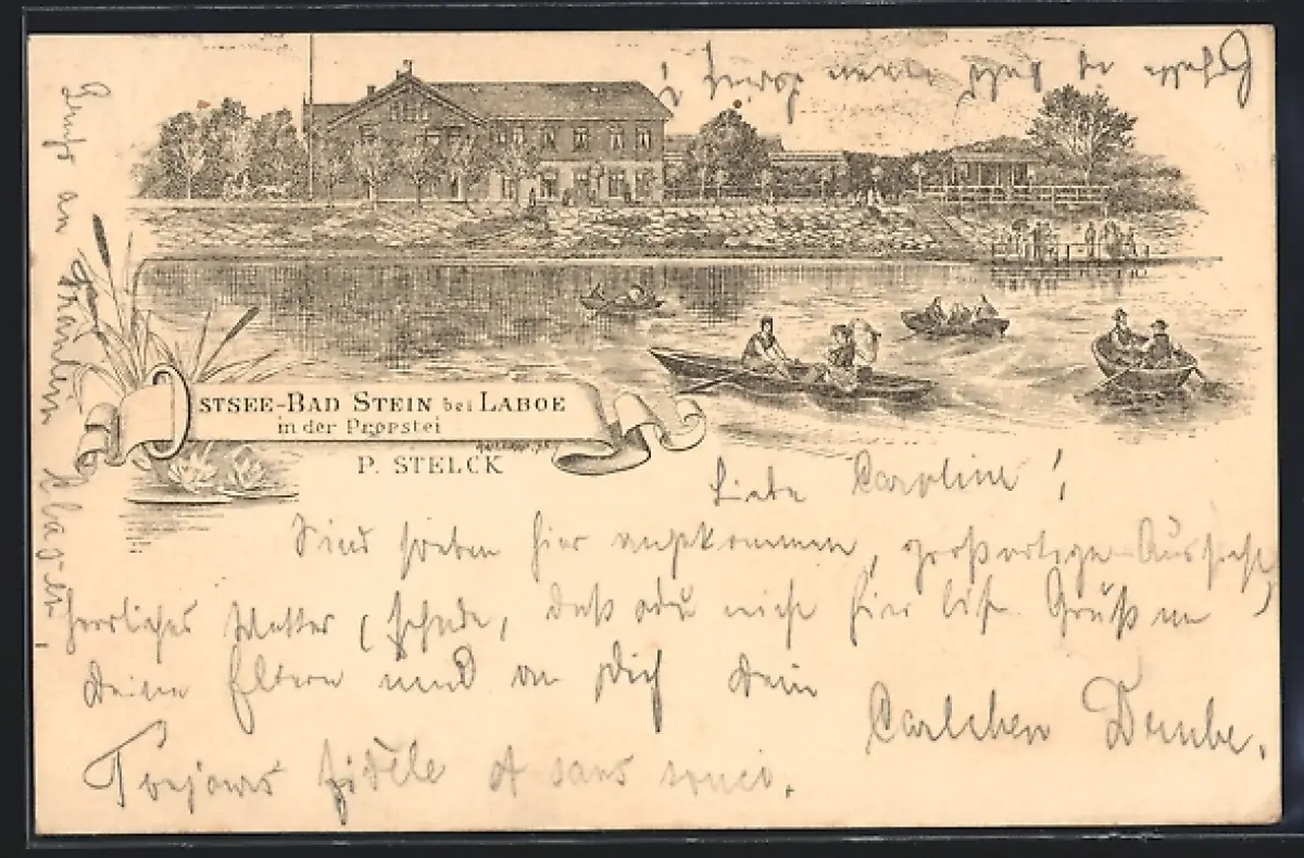 Vorläufer-Lithographie Stein bei Laboe, 1895, Ruderboote am Ufer