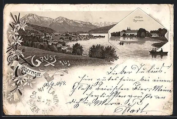 Vorläufer-Lithographie Tegernsee, 1894, Schloss Tegernsee und Blick auf die Stadt