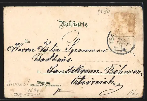 gelaufen 1894, Einriss li. mittig, Eckknicke oben und unten, Bugspur mittig, Briefmarke entfernt, rückseitig Oberflächenschaden