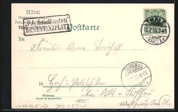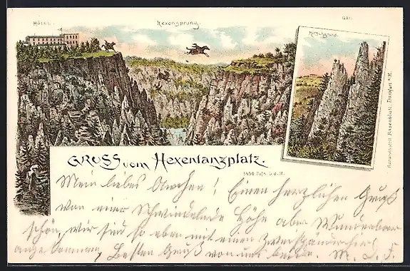 Vorläufer-Lithographie Thale / Harz, 1895, Hotel, der Hexentanzplatz mit dem Hexensprung, Hirschgrund