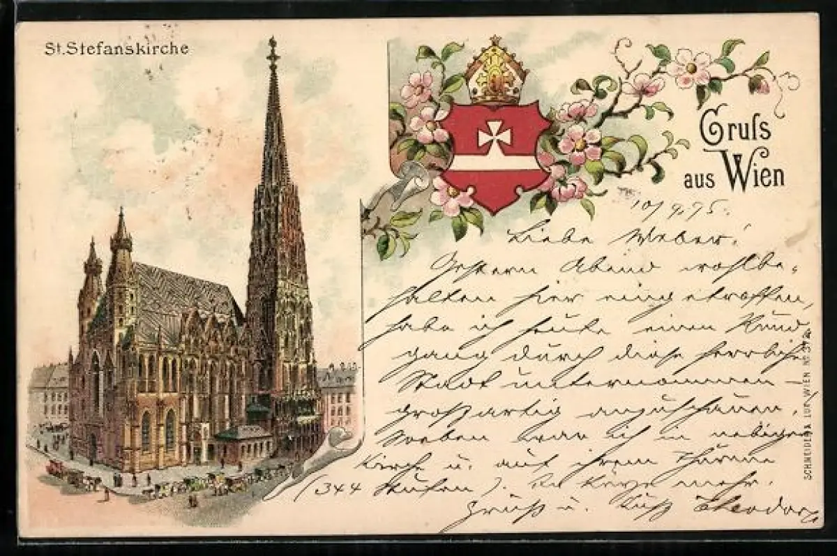 Vorläufer-Lithographie Wien, 1895, St. Stefanskirche und Wappen