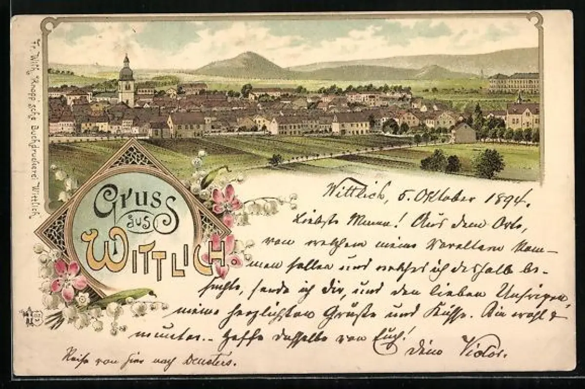 Vorläufer-Lithographie Wittlich, 1894, Ortsansicht mit Kirche aus der Vogelschau