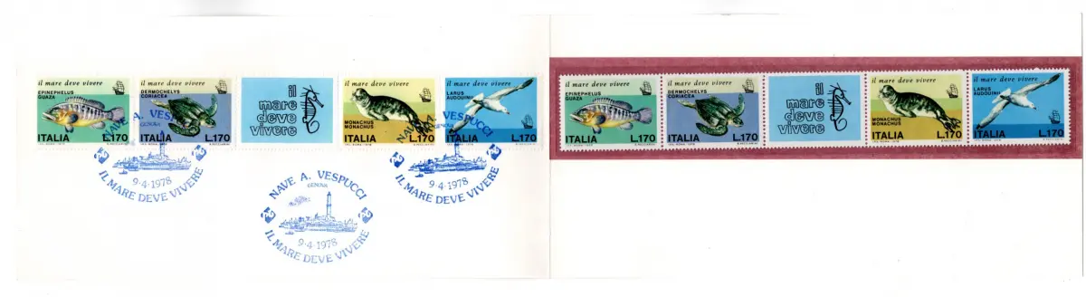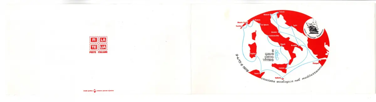 Vorläuferfolder 1978 - Ökologische Mittelmeerkreuzfahrt, ausgestellt von Poste Italiane am 9.4.1978 - Enthält die Serie Das Meer muss neu und mit bildlicher Annullierung des Schiffes A. Vespucci - Uncommon Cod. 45/WEB