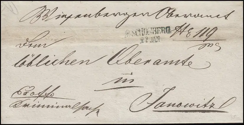 Vorphilatelie Briefhülle Zweizeiler M.SCHÖNBERG 22.1.47 nach Janowitz