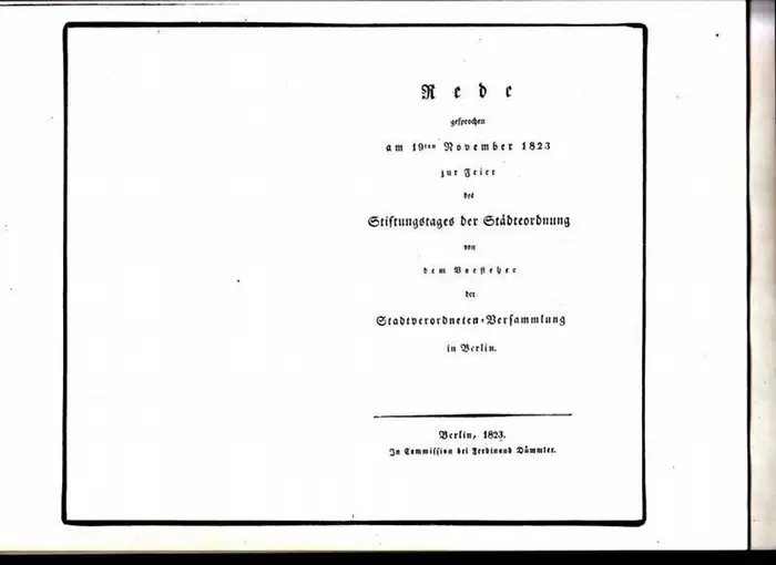 Vorsteher der Stadtverordneten-Versammlung in Berlin: Rede, gesprochen am 19. November 1823 zur Feier des Stiftungstages der Städteordnung von der Stadtverordneten-Versammlung in Berlin.