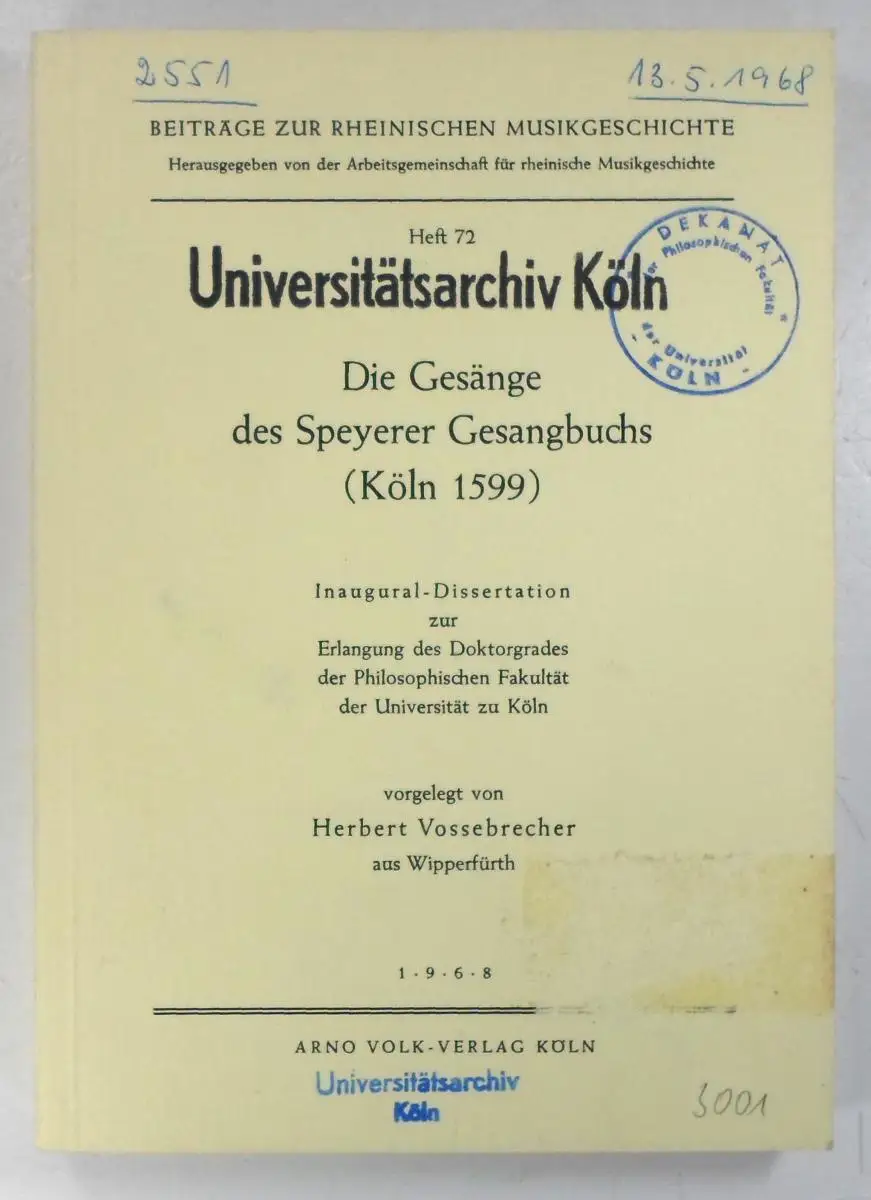 Titel: Die Gesänge des Speyerer Gesangbuchs (Köln 1599). Dissertation. (Beiträge zur rheinischen Musikgeschichte, Heft 72)