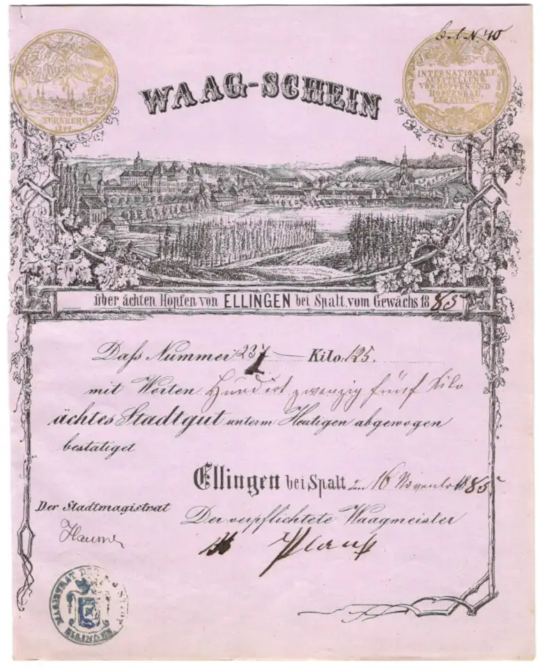 Waag-Schein Ellingen bei Spalt 1885, Ortsansicht mit Hopfenanbau, Wiege-Nummer 237