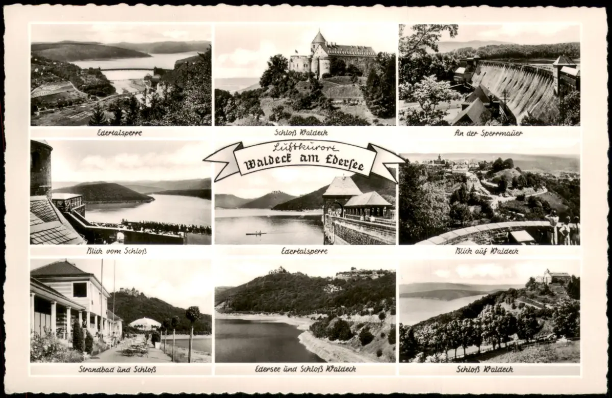 Waldeck Edersee Mehrbild-AK mit Edertalsperre Strandbad und Schloß uvm. 1950