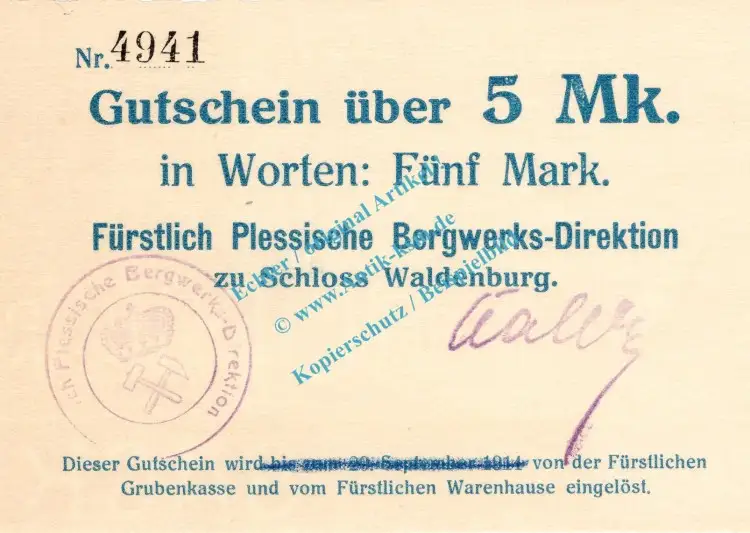 Gutschein / Banknote Fürstlich Plessische Bergwerks-Direktion zu Schloss Waldenburg , Notgeld 1914/15Bundesland : Nieder Schlesien  ,  Dießner : 415.II.3