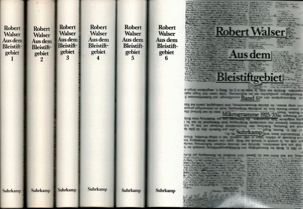 [1:] Mikrogramme aus den Jahren 1924-1925. Prosa. [2:] Mikrogramme aus den Jahren 1924 -1925. Gedichte und dramatische Szenen. (3-518-03234-8). [3:] [Der Räuber]. "Räuber"-Roman. "Felix"-Szenen. (3-518-03085-X). [4:] Mikrogramme aus den Jahren 1926-1927. (3-518-40224-2). [5:] Mikrogramme aus den Jahren 1925-1932. Prosa. (3-518-40851-8). [6:] Mikrogramme aus den Jahren 1925-1932. Gedichte und Dramatische Szenen (3-518-40851-8). - Robert Walser (1878-1956), Schweizer Schriftsteller deutscher Sprache. - Schnitt schwach angestaubt. Wohl erhalten